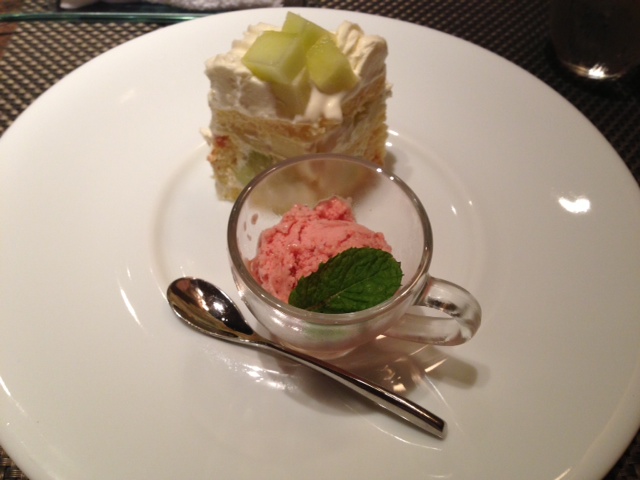 デザートはバースディケーキ(メロンのショートケーキでした)をロウソクイベントの後に切り分けたものに、シャーベットを合わせていただきました。いや、このメロンショートが美味かった!もう何も入らない、、、と思っていたのに、ペロッといってしまいました。