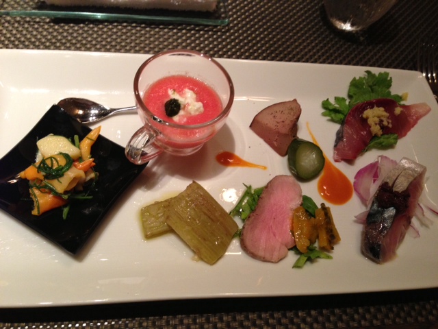 続く前菜は色取り取りの品々が一つのプレートに載せられた一品。貝やカンパチといった魚介系からスープ、ハム、パテまで本当にバラエティに富んでます。