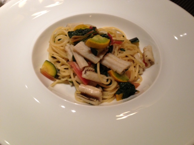 そんな腹具合ではありますが、容赦なく(笑)、続いてはパスタの登場。東京湾に近い土地柄を意識した選択肢が新鮮な印象で、その流れに乗って”小アナゴのオリーブオイルスパゲッティ”をお願いしておりました。