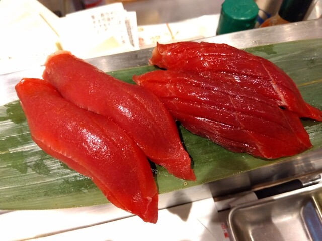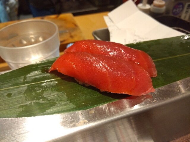 が、せっかくだから店長が席を外した間に、テツさんにマグロ赤身握りをオーダー、変化球でバンド(海苔を巻いた握り)で提供、次はこっそり舍利とマグロの間に海苔を潜ましておりました。海苔が程よく主張し過ぎずに、いい風味を出しいいバランスです。