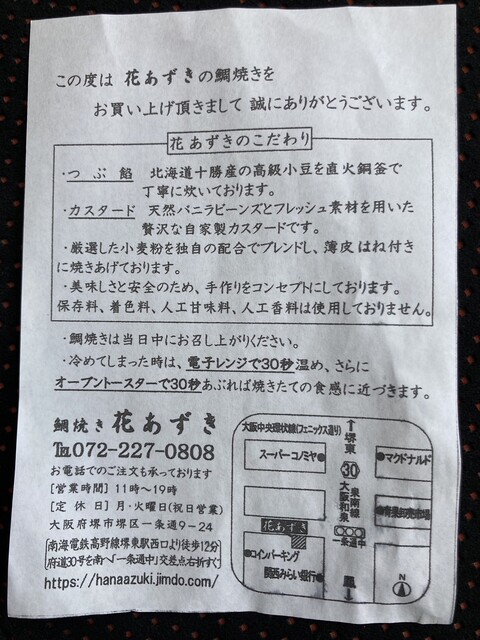 堺市堺区一条通。南海高野線堺東駅より徒歩13分。インパクトのある羽根付たい焼きで有名な 花あずきさんへ伺いました。久しぶりの訪問。嬉しいな。