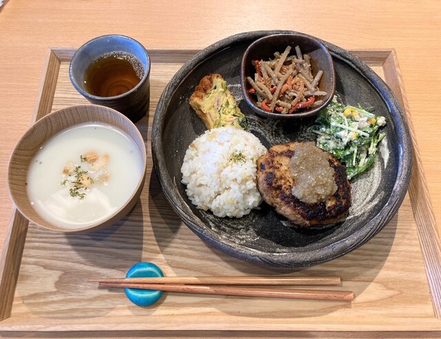 ハンバーグは味付けよく食べ応えあり。サラダにきんぴら。野菜も多くヘルシー。ジャガイモのスープは冷たく、暑い時期に嬉しいな。ワンプレートの中に滋賀県の恵みを詰め込んだこだわりを感じるお料理でバランス良く健康的な印象を受けました。