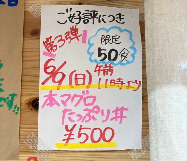 大人気の本マグロたっぷり丼はお店のInstagramや現地の貼り紙で案内されています。次回は第10弾。9月29日に限定50食販売される予定です。