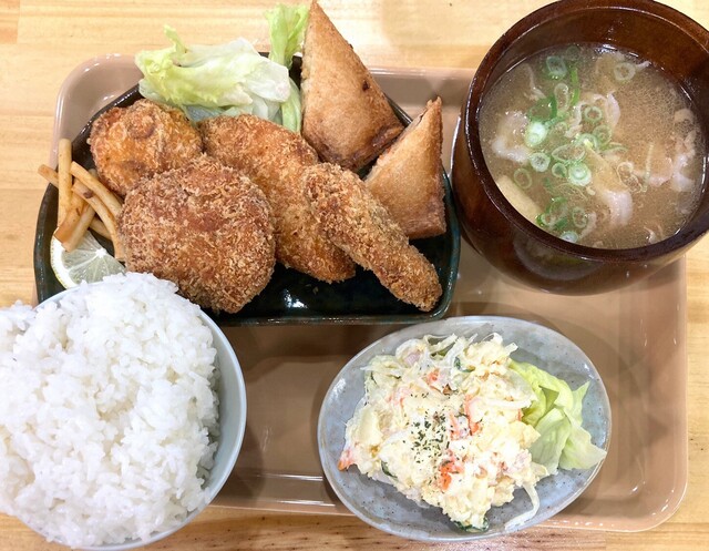 ミックスフライは白身魚、ホタテ、春巻き、メンチカツなどフライたっぷり。美味しいな。サクッと歯ごたえ良く、白身魚はふっくらした揚がり具合。
