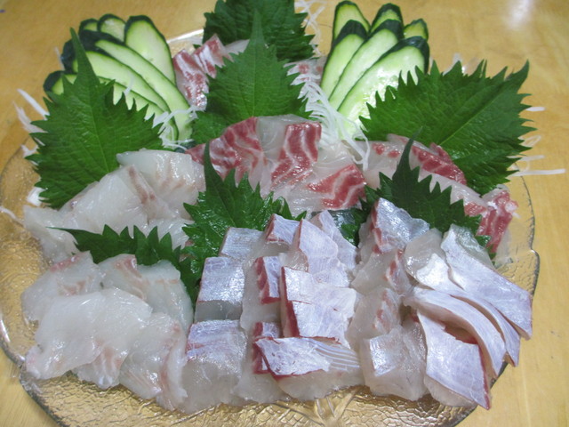 鮮度の良い「こしょう鯛」「グレ」「アイノバリ」が手に入ったので刺身盛りで一杯~♪