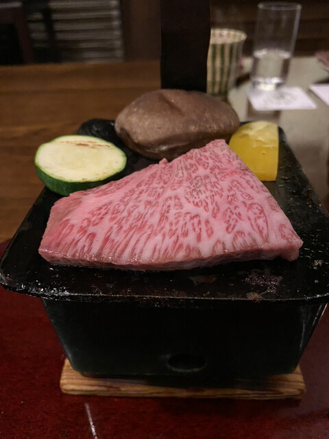 強肴:地産牛鍬焼き 赤身も霜降りも旨かった。最近は赤身の方が好きかな。