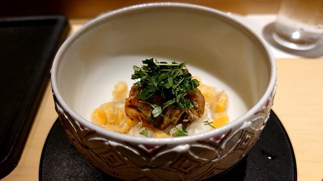 ◯飯蒸し ノドグロ、玉蜀黍、芽葱、木の芽