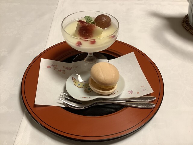 デザート:飛騨林檎の甲州煮、栗のロールケーキ、黒糖プリン