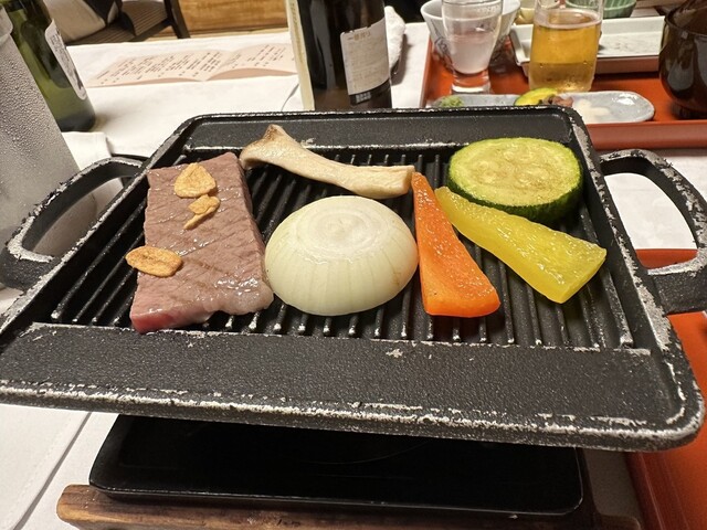 強肴は鉄板で和牛や小玉葱、ズッキーニなどを焼いて、
