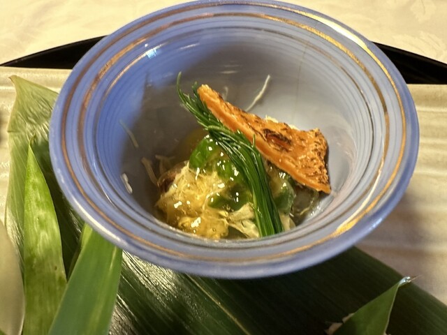 前菜 蓮の葉の上に出汁汁餡が載ってて取りながら餡を下のお料理にかけて頂きました。
