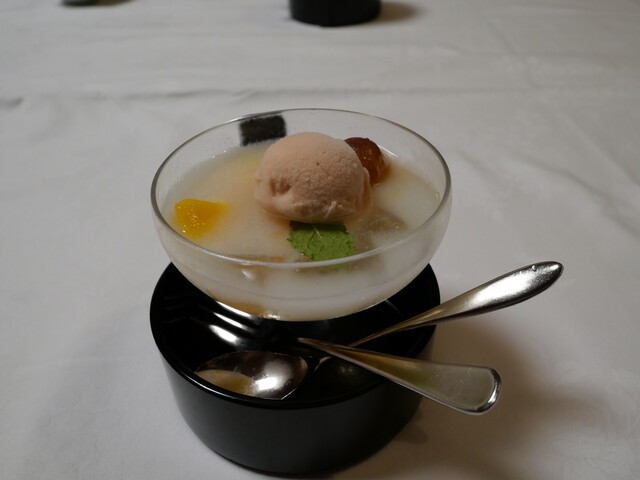 水物はスイカ、マスカット、パパイヤカラメルゼリー寄せでした。