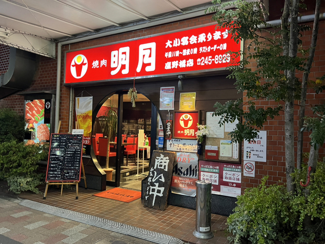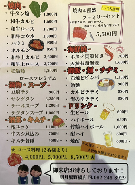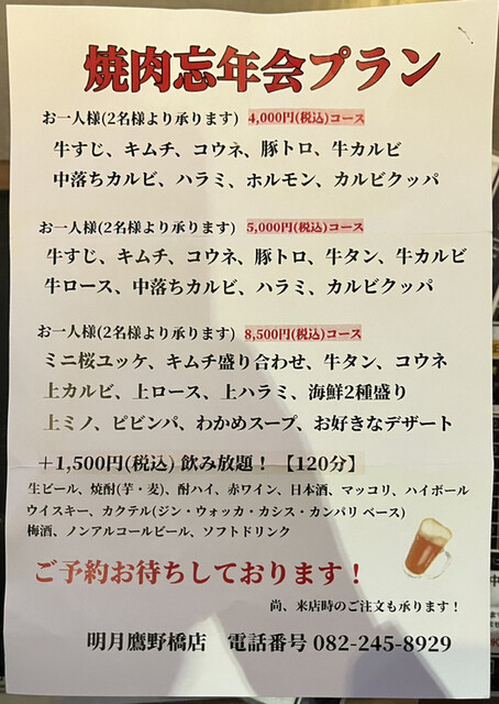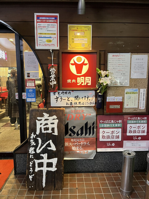 鷹野橋に美味しい焼肉屋さんがあると聞いて、手探りでやってきたのが明月さんでした。鷹野橋の電停から徒歩2分くらいです。大通り沿いにあり、わかりやすいお店でした。祝日(3連休最終日)の18:00くらいにお伺いし、待ちはなしでした。