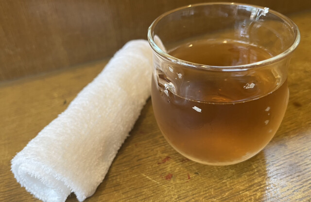夜にお伺いしたことしかないぐりさん。ランチに初めてお伺いしました。木曜日の12:20頃にお伺いし、先客5名(空席2席)、後客1名。結構人気ですね。暑いので、冷たいお茶とキンキンのおしぼりはサイコーです。