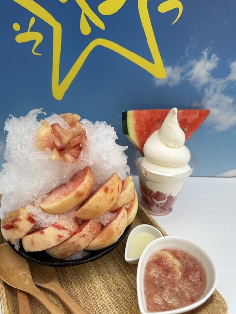 たこ焼きが食べたくて行ったけど、フルーツかき氷等も美味しそうだったのでたこ焼きはテイクアウトして、お店で桃のかき氷とスイカのソフトを注文しました。