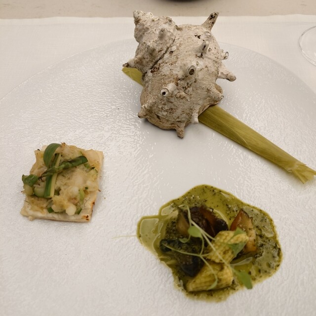 スタートを飾る前菜では、毛蟹のタルトレットや地サザエのソテーが、海辺のリゾートらしい潮の香りを運んできます。ルッコラバターの香ばしさや新玉ねぎのプランマンジェのなめらかさが、序盤から食欲をそそる組み合わせ。中でも北海道産ウニの濃厚なコクは、最初の印象をぐっと引き締めてくれました。