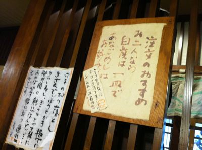 「注文のおすすめ」って貼り紙です。「お二人なら白焼きは一皿で
