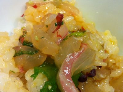 ポイントは「まず鯛の身と薬味を出汁に全部入れる」ということです。