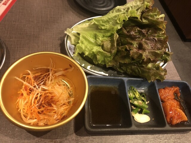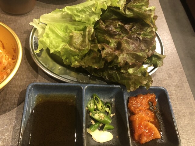 サムギョプサルはレタスにお肉を挟んで頂きます。間に玉ねぎやコチジャンなどを挟み、良い感じの辛さにして、一口サイズでパクリ。