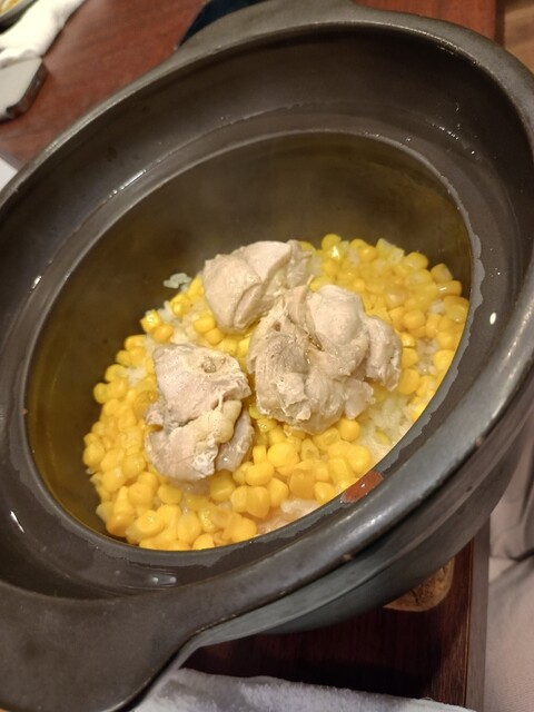 鶏肉とコーンの土鍋ご飯。→最後はお出汁を入れてお茶漬け風に。締めで重そうと最初は思いましたがペロリ。