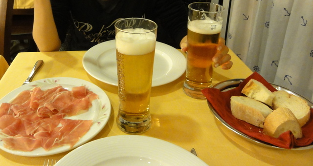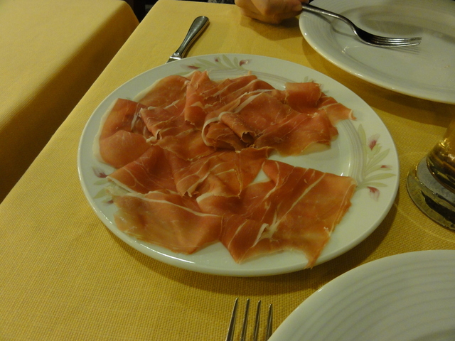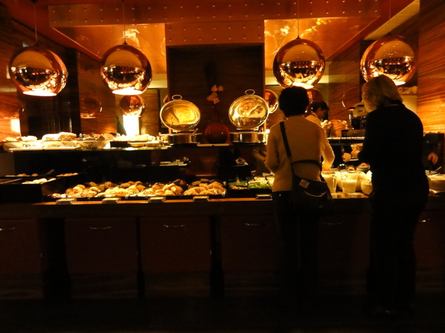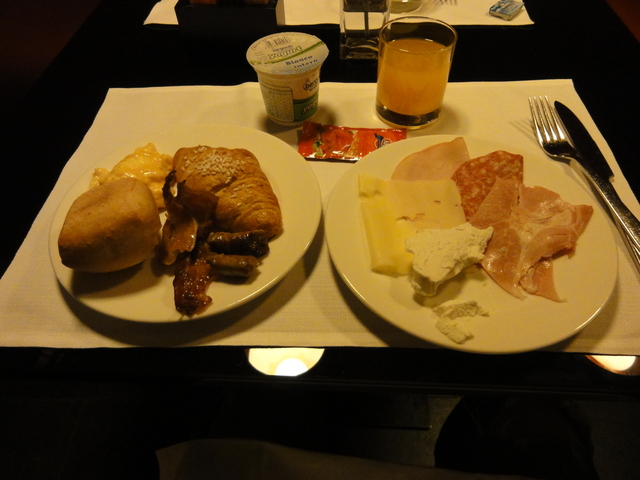 ホテル朝食。パン、ハム、チーズのオンパレード
