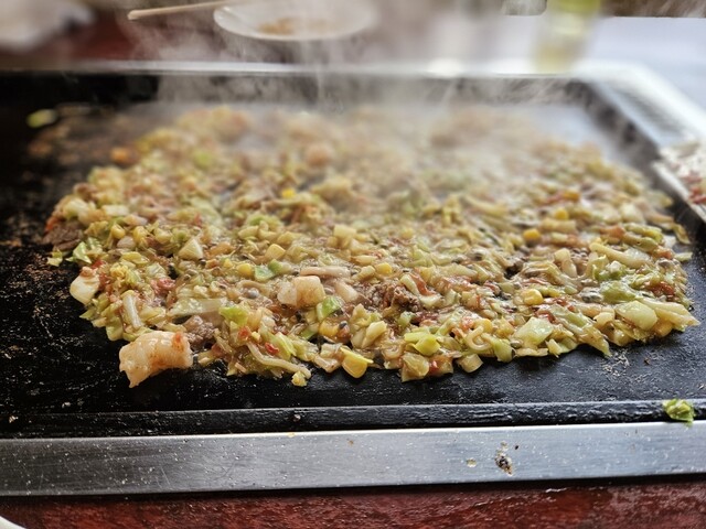 鉄板焼きが豪華で美味しい!です。もんじゃ(能登ミックス)と焼そばを頂きお腹パンパンです。