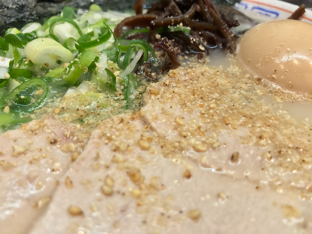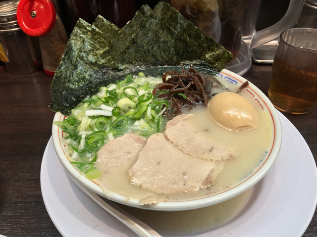 築炉釜出しとんこつラーメソに、チャーシュー、ねぎ増、きくらげ増、味玉、海苔4枚がのせられたもの。