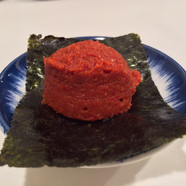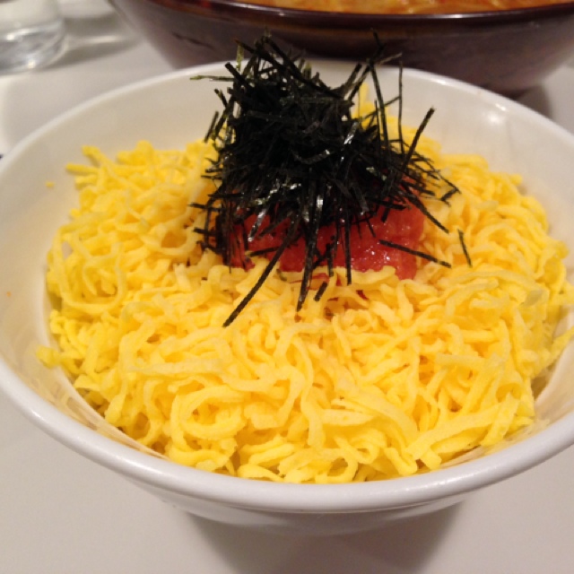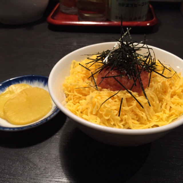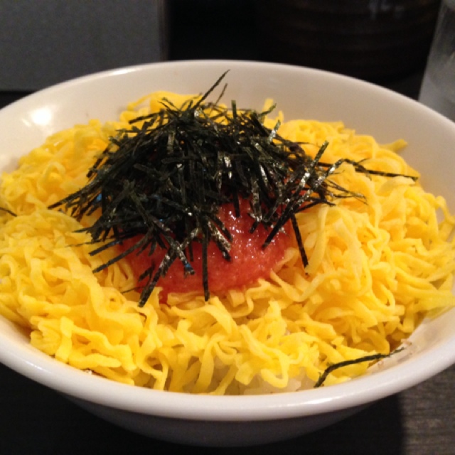 すみれ味噌明太子ごはん。すみれの味噌に漬けた明太子と、錦糸卵がのせられている。平日ランチタイムはラーメンとのセットもあるよ
