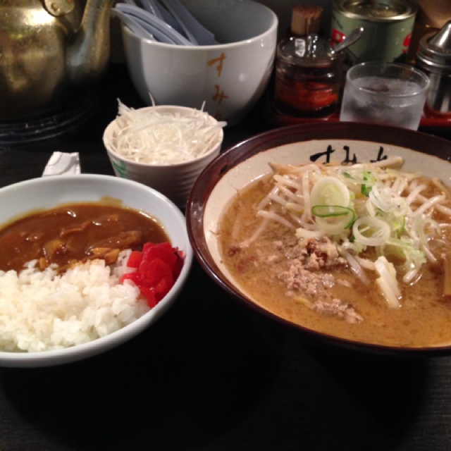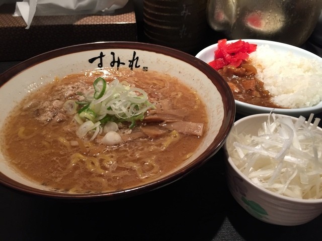 平日限定、味噌ラーメンランチ、今日は鬼飯で。平日限定のランチはごはんもの3つのうちから1つを選べます。ラーメン屋さんのカレー、すみれ味噌明太子ご飯、鬼飯。ねぎを追加♡