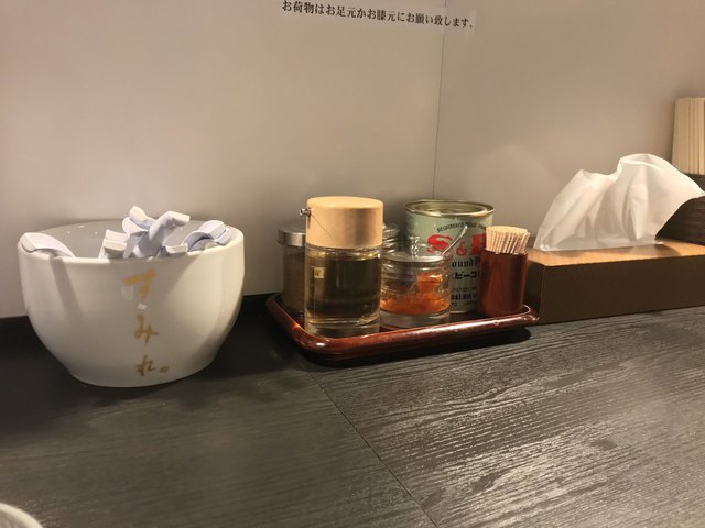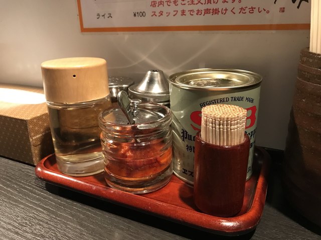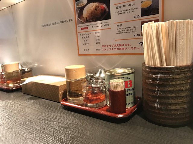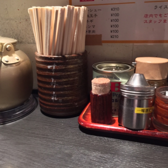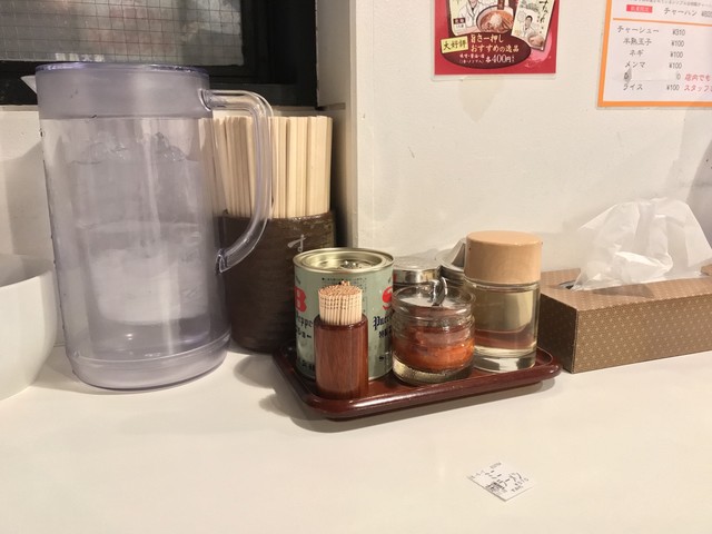 カウンターの上はこんな感じ。充実の調味料、孤高の割り箸。偉大なやかん。