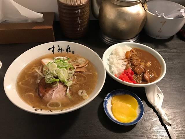 平日11時〜15時限定、ランチセットが登場! 味噌ラーメンセット。ごはんものを選べるのだけど、選んだのは「ラーメン屋さんのカレー」! すみれの味噌ラーメンとカレーライスですよ!