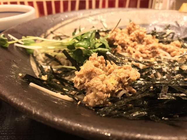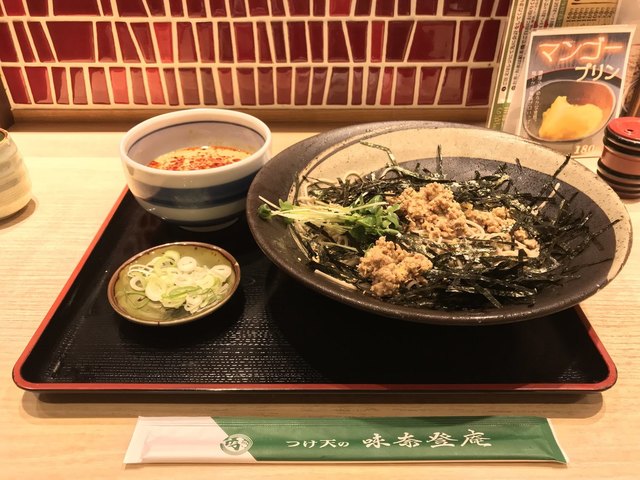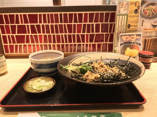 メニュウの写真を見れば、ひき肉や海苔が惜しげもなくのせられ、ほどよい辛さを想像させるつゆも楽しめそうであり、気になる。