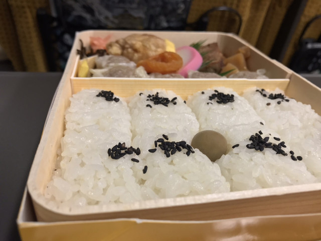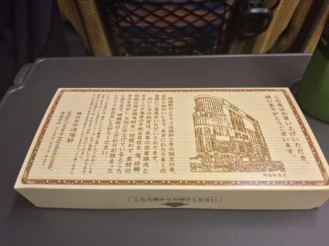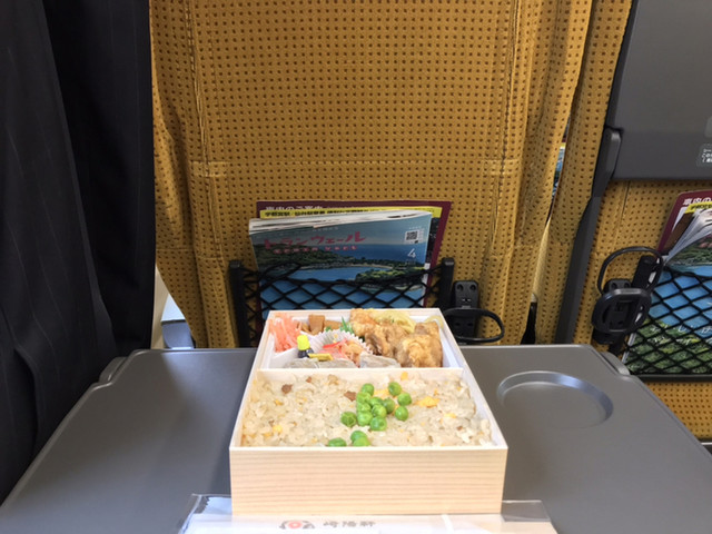 同じく駅構内の売店で購入したおにぎりやお茶とともに。
