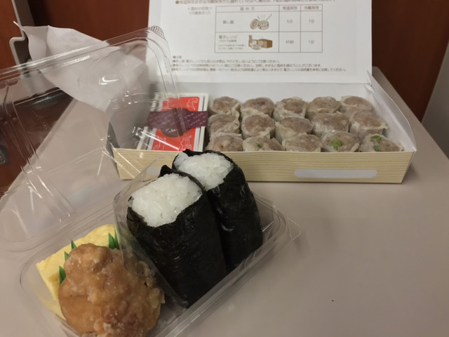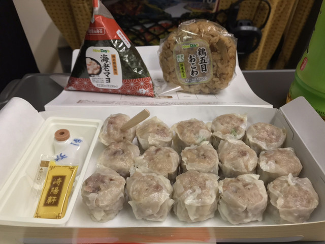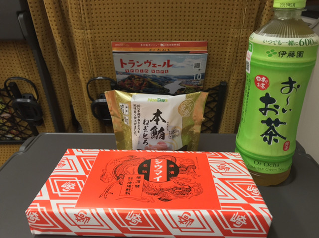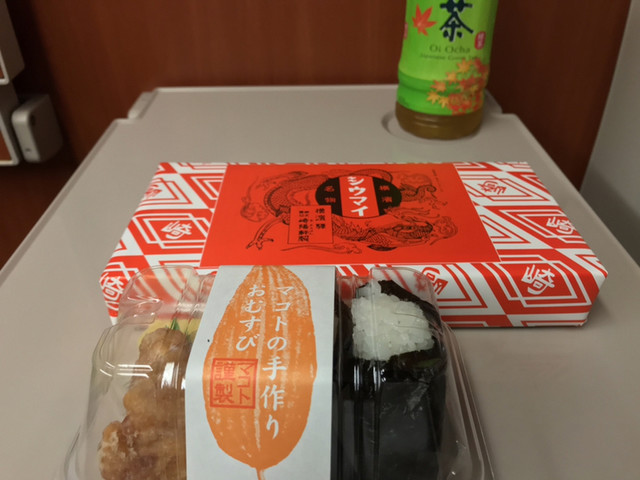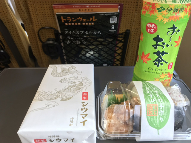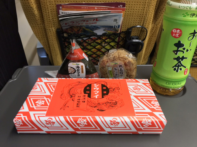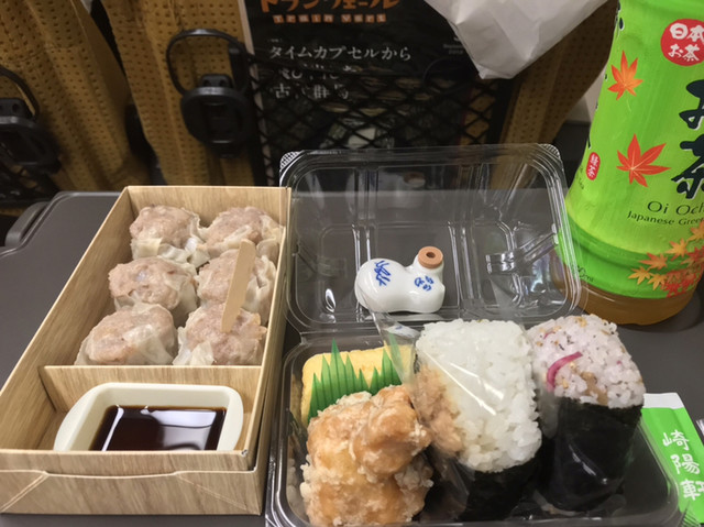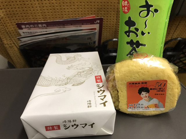 駅構内の売店で購入したおにぎりやお茶とともに。