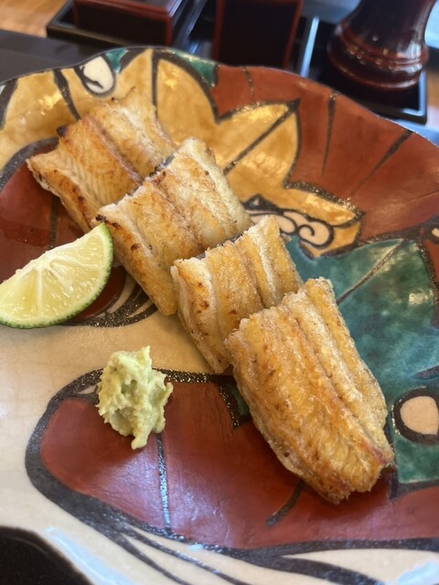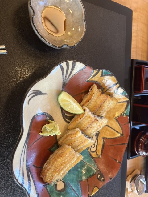 そして割きたてうなぎ白焼き 白焼用の醤油と塩も一緒にサーブされます♪ 最初は何もつけず そして土佐醤油 お塩 ワサビと味変楽しみました♪ さっきまで生きてた鰻が割かれてこんなに美味しいただき本当自然と生き物に感謝です。