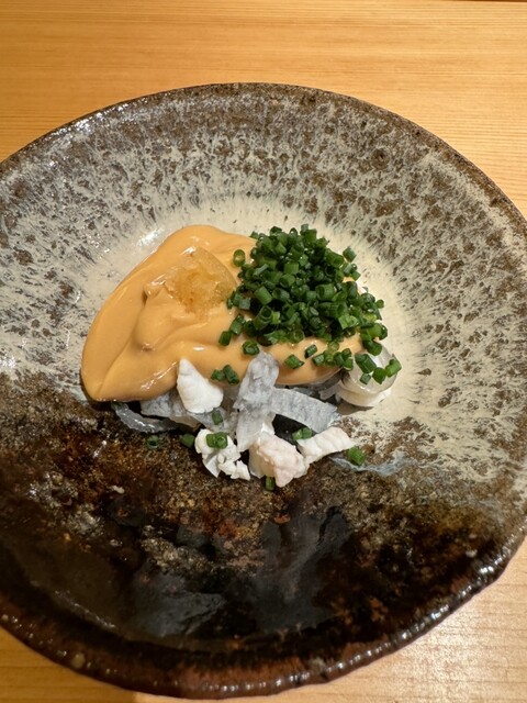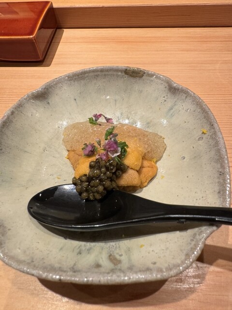 ●鮑(唐津)と紫雲丹(噴火湾)のキャビア乗せ