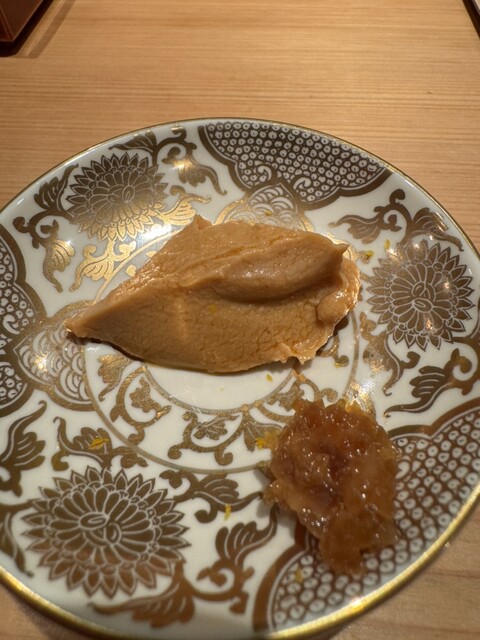 ●鱈の白子、紫雲丹、キャビアの上に甘酢のジュレ