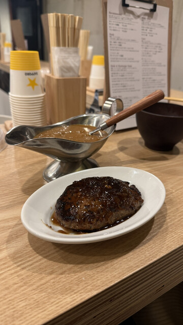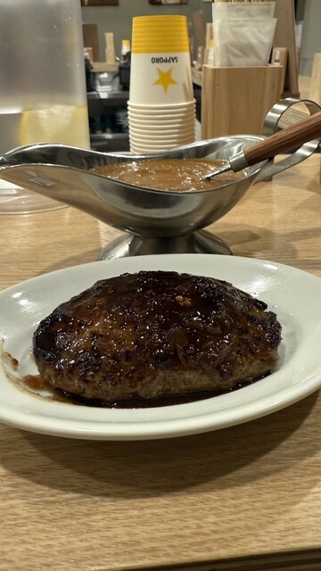 レアなハンバーグにバターがとろけ、カレーソースのスパイスが効いていて、和と洋の融合が面白い一皿でした。
