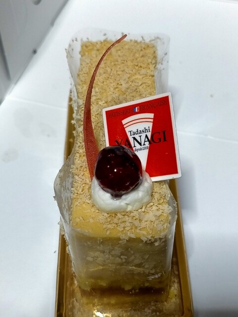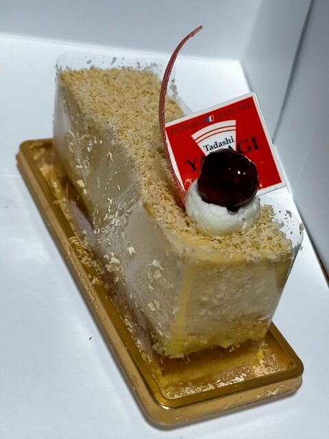 ムーススリーズ(¥540) スリーズは仏語でサクランボのこと。上がサクランボの、下がホワイトチョコのムースです。サクランボムースは酸味とチェリーリキュールかな?そんな風味。ホワイトチョコムースはコッテリと甘いです。縦に切りだしていただくと、ちょうどいい甘酸っぱさ♪ カシスに比べ穏やかな酸味のサクランボがホワイトチョコの風味と合わさり、ふうわりと優しく溶けていきました♪