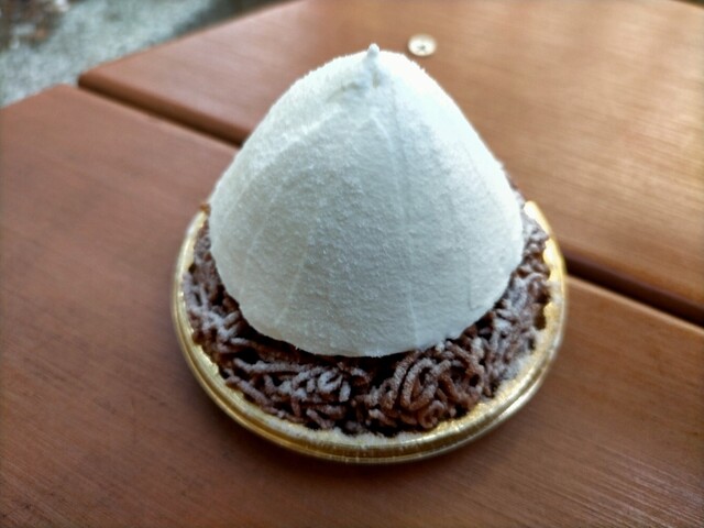 【モンテ・ビアンコ、¥700くらい】コチラのスペシャリテです。雪にも色々あるが、新雪並の繊細さのホイップ生クリームです。山の形をギリギリ維持できる立て具合。麓にあたるマロンペーストは、ギュッと濃縮感があり、濃厚な風味(^^♪ 土台には、カカオ風味の焼きメレンゲ。ほろ苦さで、全体をシメてくれました。