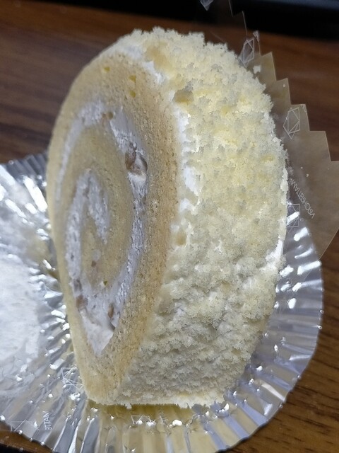 【マロンロール、¥330】期間限定のしな。ふわふわクランブルを纏ったロールケーキをパク~(^ω^)♪ ふわふわスポンジに、生クリに仕込まれたマロングラッセのラム風味が良いね〜(ノ≧∀≦)ノ