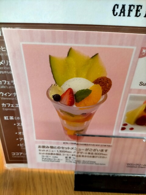 【パルフェ セゾン(夏向きのパフェ)、¥800】単品でオーダーしました。メニュー写真との一致度が高くて素晴らしい。パクリ〜(^ω^)♪ フルーツはどれも新鮮、かつ、ほどよく熟してて食べ頃です(≡^.^≡)♪