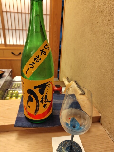 日本酒を入れたワイングラスには富士山と朝日が見える。