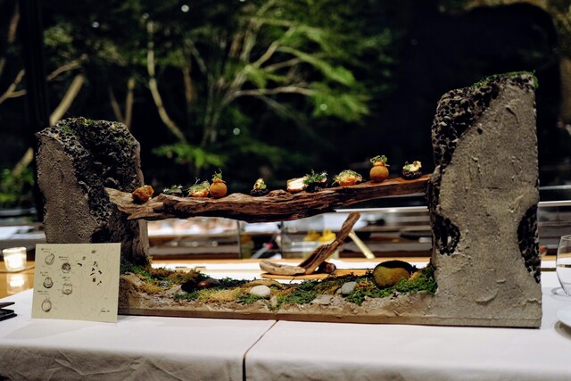 新しいアイデアが次々と創造され、毎年、全く違う料理を新しいオブジェ器で頂き、素材、ソース、山菜、玉子、器、オブジェ、全て凝っていている、最初から最後まで驚かされるディナーでした。