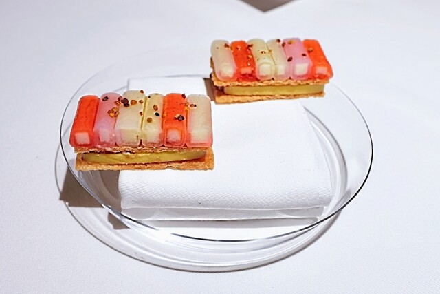 バッテラの鯖と酢飯の間に刻んだガリが入っていると、すごく美味しいですが、それをフレンチで進化させた料理のようでした。
