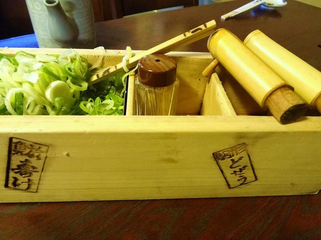 テーブルの上にはどっさりのネギと七味、山椒 この山椒がとても美味しいのです