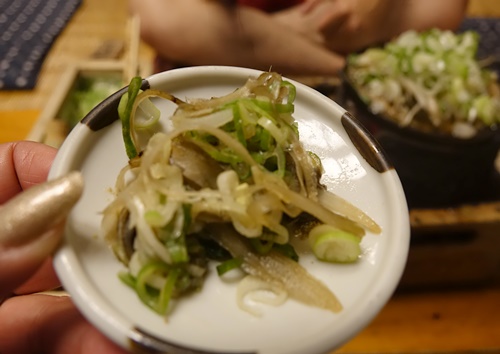 ごぼうのささがきも頼み、テーブルに置かれた葱をどっさり入れ~山椒をかけて・・・