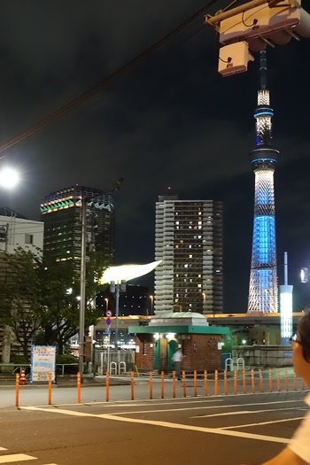 スカイツリーのライトアップを左手に見ながら、浅草から歩いても5~6分