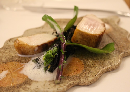 鰤と赤菜苔 見た目はお肉ですがお魚です~お魚・鰤です 赤身が残ったロースト具合がとろける~~
