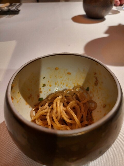 よだれ鶏の数種の食し方はやはり絶品です。お魚、お肉はフレンチ、幸せのパエリアはスペイン、山椒を練り込んだ麺、次は?次は?と、テーブルに運ばれて来るお料理に何度訪れても心が踊ります。