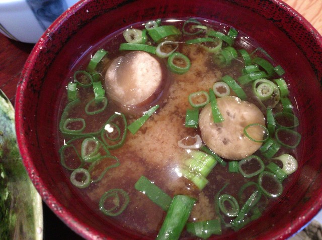 味噌汁には具として好きなナスが入っています。地元名産の七味は味噌汁に入れるみたいです。